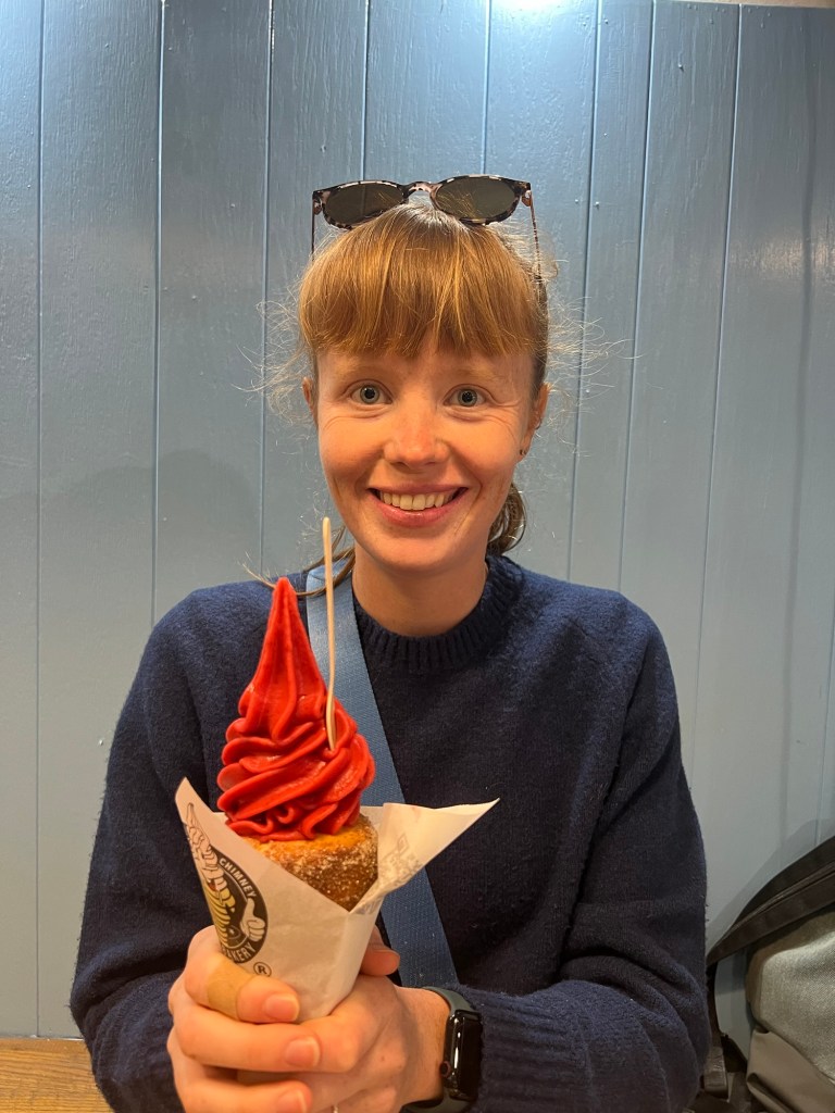 The following day, we were feeling like a sweet treat, and Prague is famous for its chimney cake dessert, or trdelník, which is a dough pastry that is crispy on the outside, soft on the inside and coated with granulated sugar and cinnamon. It is baked over an open flame and served with ice cream. We had pretty much ruled out being able to try it since it doesn’t fit either of our dietary restrictions, so you can imagine how thrilled we were when we stumbled upon a store that served a vegan and gluten free option!! It was absolutely delicious and such a nice unexpected treat. After we had our chimney cake, we continued walking and ended up in Letna Park overlooking the city. It was a beautiful, warm, sunny day and we soaked it all in as we enjoyed some candy and took in the views. We sat right under the metronome and had the best time relaxing and seeing the city from above. This was our last day in Prague and we thought we were ending on a high note, until we tried to go home on the subway and our day was soured by what happened next…