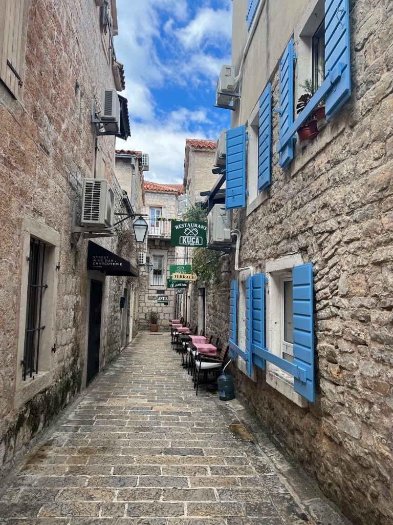 Less than an our away by bus along the Adriatic sea is the beautiful town of Budva. The weather turned around here for our 3 nights and 2 full days to explore which we were more than grateful for. The old town in Budva was full of Medieval architecture, more cobble stone streets and stone buildings, and of course, plenty of cats! We enjoyed walking along the coast from the old town to Fort Mogren one day, which offers breathtaking views of the town below, the surrounding cliffs and the sea.